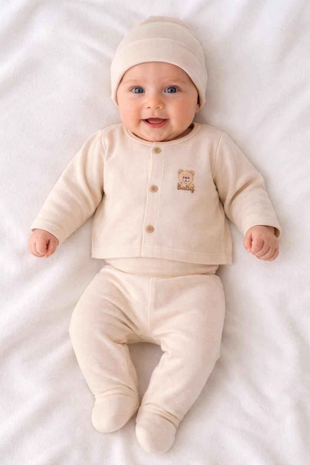 Composto por casaco, body e calça (mijão), o conjunto oferece um look completo e funcional, facilitando na hora de vestir. Produzido em tecido macio e confortável, é perfeito para a pele sensível do bebê, garantindo bem-estar e liberdade de movimento.