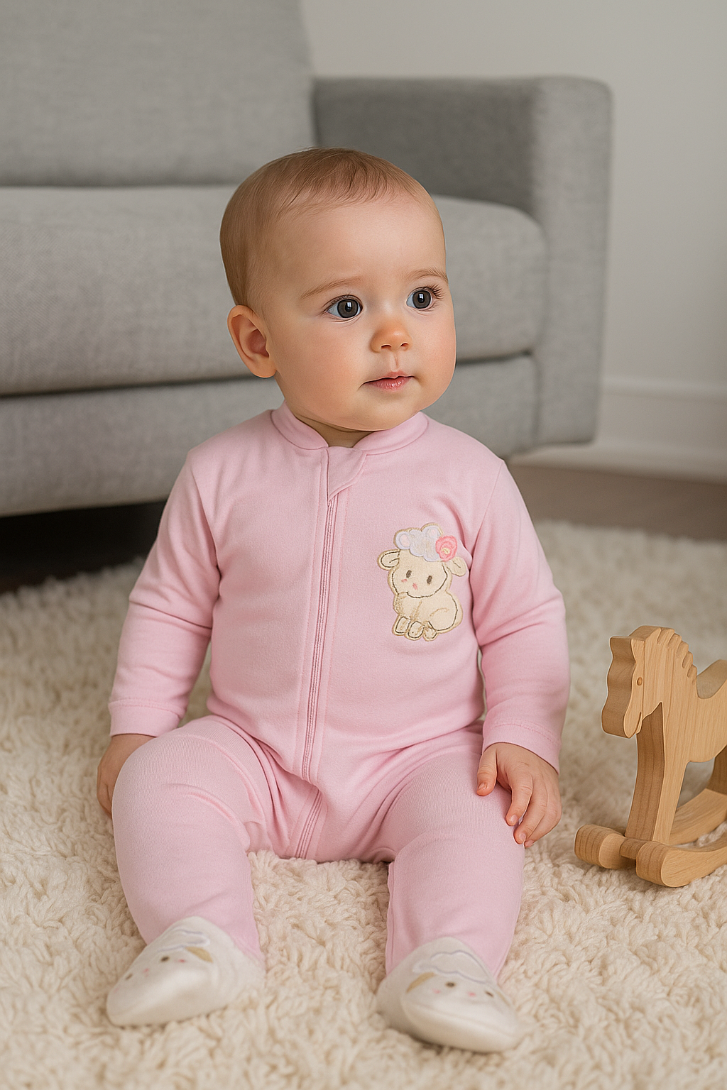 Confeccionado em suedine 100% algodão, proporciona maciez, respirabilidade e cuidado ideal para a pele sensível do bebê. O bordado de carneirinho nos pés e no bumbum traz um charme especial à peça, enquanto o fechamento com zíper garante praticidade na hora da troca.