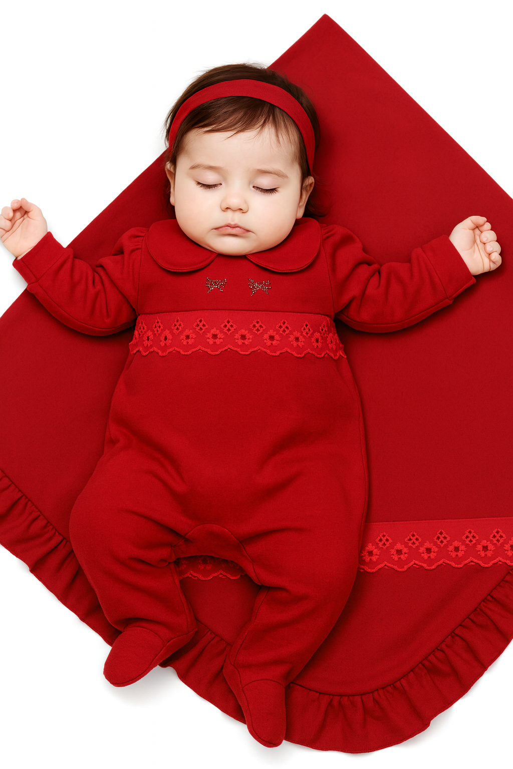 O conjunto é composto por macacão, tiara e manta, peças pensadas para proporcionar conforto e elegância. Os detalhes em strass trazem um toque sofisticado e delicado, tornando o look perfeito para a tão esperada saída da maternidade e para registrar as primeiras fotos do bebê.